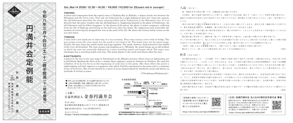 2026年3月14日(土)12時30分開演 於:矢来能楽堂