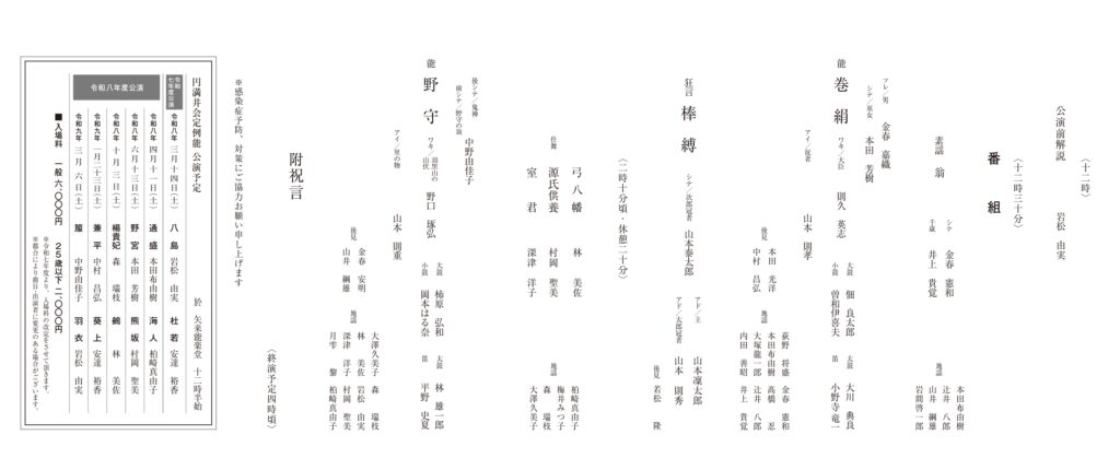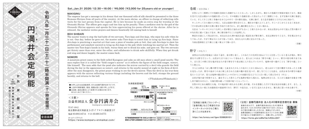 円満井会定例能 本田芳樹師 能「巻絹」 2026年1月31日(土)12時30分開演 於:矢来能楽堂 ■チケット購入申し込みフォーム 各自由席 一般 6,000円 25歳以下 2,000円 お申込みおよびお問い合わせ honda.syurei@gmail.com TEL:080-3020-5700 FAX:03-5942-9450