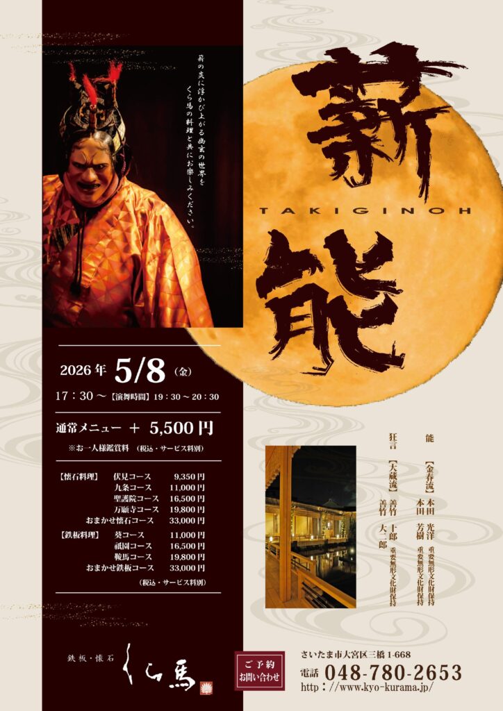 鉄板・懐石くら馬 薪能 2026年5月8日(金)17時30分 お申込みおよびお問い合わせ 鉄板・懐石くら馬(さいたま市) https://www.kyo-kurama.jp/blog/20260301112940/ TEL:048-780-2653